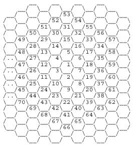 The 23 rd Annual ACM International Collegiate Programming Contest WORLD FINALS: Problem A Bee Breeding Professor B. Heif is conducting experiments with a species of South American bees that he found during an expedition to the Brazilian rain forest. The honey produced by these bees is of superior quality compared to the honey from European and North American honey bees. Unfortunately, the bees do not breed well in captivity. Professor Heif thinks the reason is that the placement of the different maggots (for workers, queens, etc.) within the honeycomb depends on environmental conditions, which are different in his laboratory and the rain forest. As a first step to validate his theory, Professor Heif wants to quantify the difference in maggot placement. For this he measures the distance between the cells of the comb into which the maggots are placed. To this end, the professor has labeled the cells by marking an arbitrary cell as number 1, and then labeling the remaining cells in a clockwise fashion, as shown in the following figure.