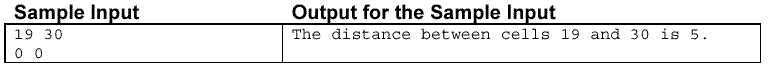 For example, two maggots in cells 19 and 30 are 5 cells apart. One of the shortest paths connecting the two cells is via the cells 19 - 7 - 6 - 5 - 15 - 30, so you must move five times to adjacent cells to get from 19 to 30. Professor Heif needs your help to write a program that computes the distance, defined as the number of cells in a shortest path, between any pair of cells. Input Output