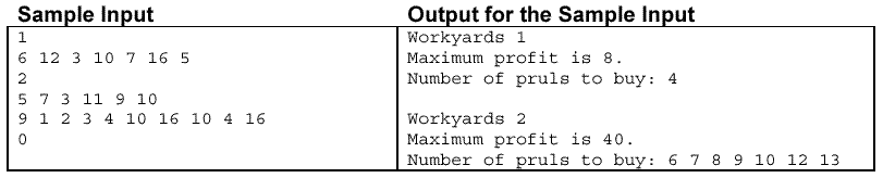 The 23 rd Annual ACM International Collegiate Programming Contest WORLD FINALS Problem E Trade on Verweggistan Since the days of Peter Stuyvesant and Abel Tasman, Dutch merchants have been traveling all over the world to buy and sell goods. Once there was some trade on Verweggistan, but it ended after a short time. After reading this story you will understand why. At that time Verweggistan was quite popular, because it was the only place in the world where people knew how to make a ‘prul’. The end of the trade on Verweggistan meant the end of the trade in pruls (or ‘prullen’, as the Dutch plural said), and very few people nowadays know what a prul actually is. Pruls were manufactured in workyards. Whenever a prul was finished it was packed in a box, which was then placed on top of the pile of previously produced pruls. On the side of each box the price was written. The price depended on the time it took to manufacture the prul. If all went well, a prul would cost one or two florins, but on a bad day the price could easily rise to 15 florins or more. This had nothing to do with quality; all pruls had the same value. In those days pruls sold for 10 florins each in Holland. Transportation costs were negligible since the pruls were taken as extra on ships that would sail anyway. When a Dutch merchant went to Verweggistan, he had a clear purpose: buy pruls, sell them in Holland, and maximize his profits. Unfortunately, the Verweggistan way of trading pruls made this more complicated than one would think. One would expect that merchants would simply buy the cheapest pruls, and the pruls that cost more than 10 florins would remain unsold. Unfortunately, all workyards on Verweggistan sold their pruls in a particular order. The box on top of the pile was sold first, then the second one from the top, and so on. So even if the fifth box from the top was the cheapest one, a merchant would have to buy the other four boxes above to obtain it. As you can imagine, this made it quite difficult for the merchants to maximize their profits by buying the right set of pruls. Not having computers to help with optimization, they quickly lost interest in trading pruls at all. In this problem, you are given the description of several workyard piles. You have to calculate the maximum profit a merchant can obtain by buying pruls from the piles according to the restrictions given above. In addition, you have to determine the number of pruls he has to buy to achieve this profit. Input This is followed by w lines, each describing a pile of pruls. The first number in each line is the number b of boxes in the pile (0 <= b <= 20). Following it are b positive integers, indicating the prices (in florins) of the pruls in the stack, given from top to bottom. The input is terminated by a description starting with w = 0. This description should not be processed. Output